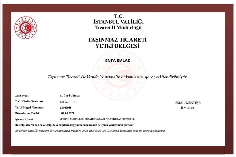 Taşınmaz Ticareti Yetki Belgesi ne Sahip Bir Emlak Ofisi dir.