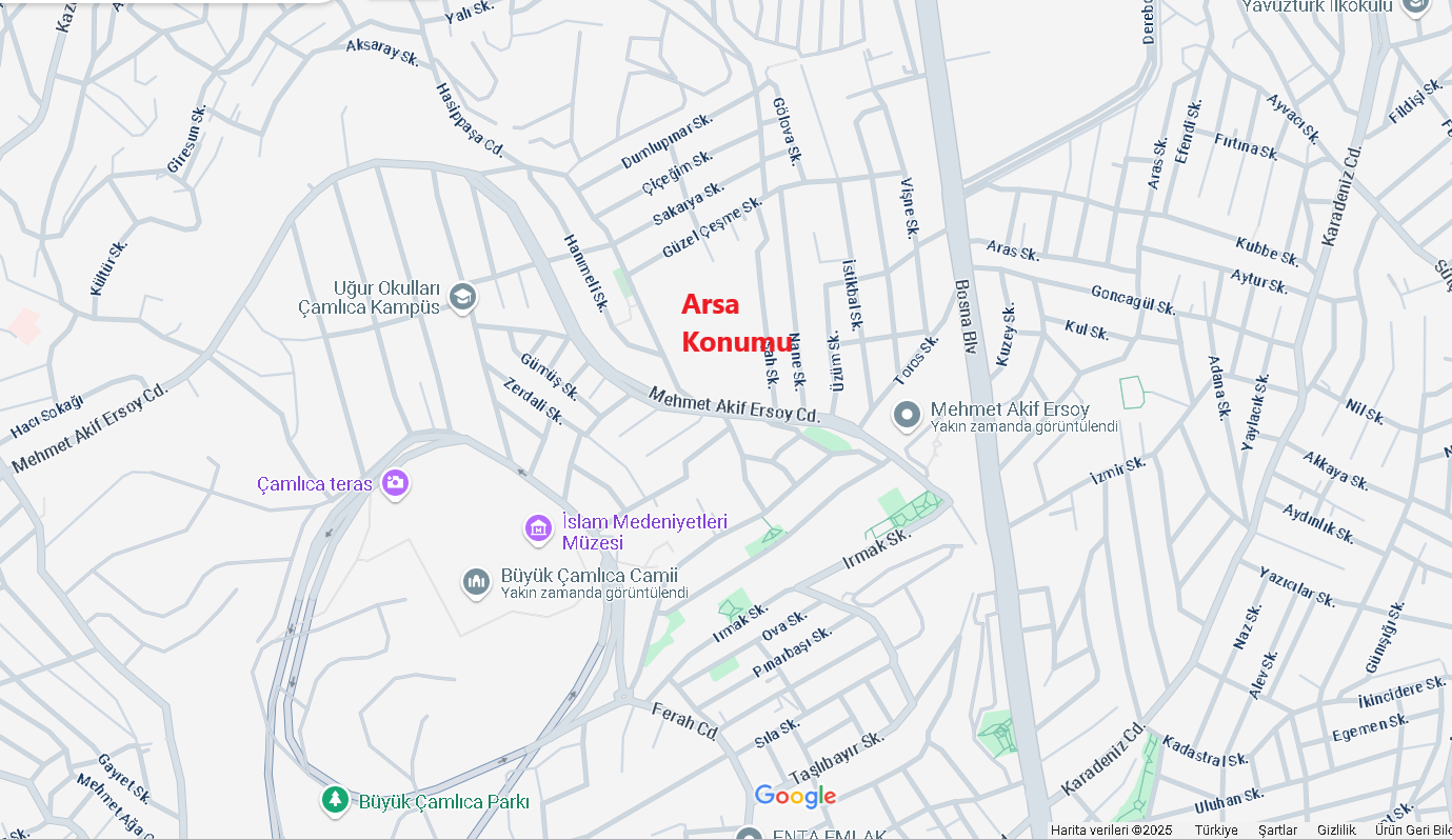 Mahallemize Metro Geliyor. Çamlıca Mehmet Akif Ersoy Mahallesi Ada Bazlı İmarlı Arsa Bölgede Ada Bazlı Dönüşümlerin Başladığı Bir Konumda 100 M2 5.000.000 50 M2 3.000.000 TL Çamlıca Camii METRO 900 METRE ( İnşaat Devam Ediyor ) Bosna bulvarı 400 Metre Altunizade Metrobüs 4.5 Km Beylerbeyi 3.5 Km Çengelköy 3.5 Km,Üsküdar Marmaray,İskele 7 Km Söğütlü Çeşme Tren İsatasyonu 7.5 km Avrasya Tüneli 9 Km,Kadıköy 9 Km Taksim 13 Km Harem Otogarı 9 km HavaalanIı 35 Km EMLAK OFİSLERİNİN TAŞINMAZ TİCARETİ BELGESİNİ SORGULAYINIZ https://ttbs.gtb.gov.tr/ Yetki Belge Sorgula dan Bakınız Ofisi miz İstanbul Valiliği Ticaret İl Müdürlüğü Taşınmaz Ticareti Yetki Belgesi ne Sahip Bir Emlak Ofisi dir Belge No : 3400038 2007 Yılındandan Beri Aynı Mahallede Aynı İsimle Hizmetteyiz.